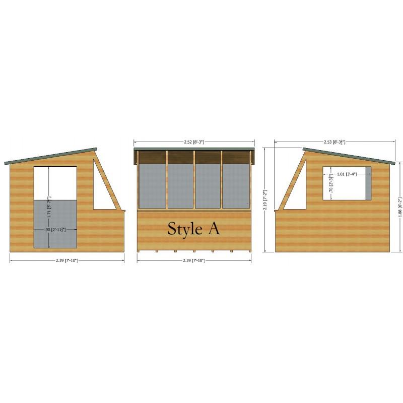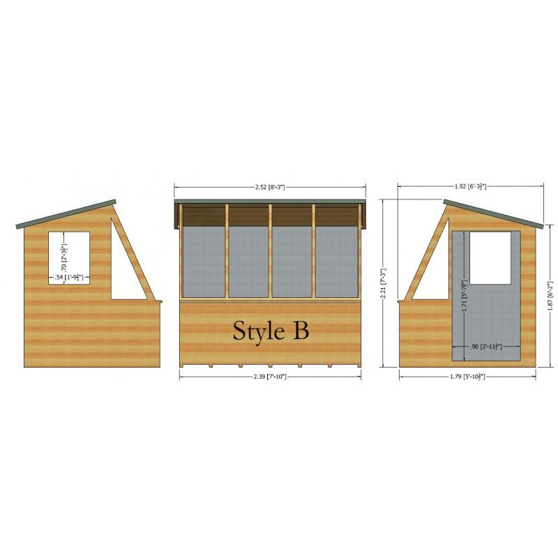 Part greenhouse / part shed for a variety of uses. For safety reasons the large front window does not open and is supplied with plastic glazing. Photograph shows 8×8 (2390×2390 mm) style B with the stable door option hung on the right. The workbench is available as an optional extra, as is the stable door.